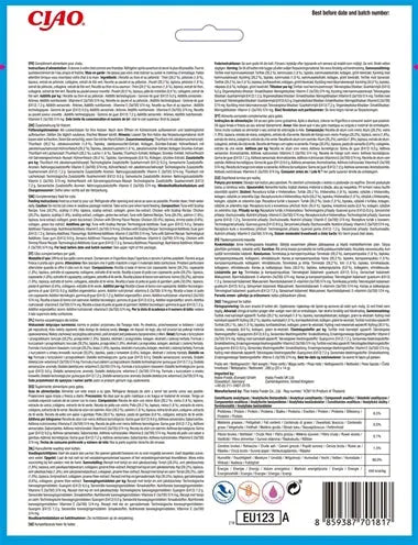 Tuna With Scallop Recipe (5x): Water, tonijn, tapiocazetmeel, coquille, natuurlijke coquillesmaak, natuurlijke smaakstoffen, guargom, vitamine E-supplement, taurine, groene thee-extract