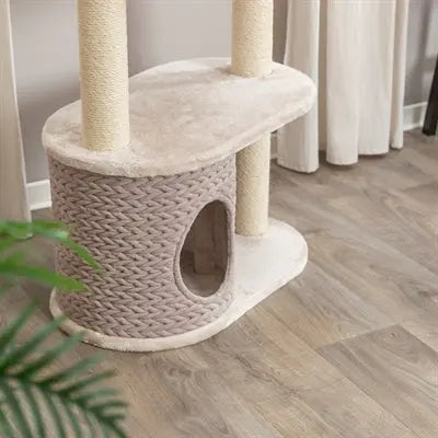 De Trixie Krabpaal Alessia Lichtgrijs/Zand 65X38X114 cm is vervaardigd uit hoogwaardige materialen zoals jute, pluche en velours. Het gevoerde ligplateau biedt extra comfort en wordt geleverd met een afneembare relax-mand. De schuilplaats, gemaakt van zacht velours, biedt je kat een knusse plek om te rusten. Daarnaast is de krabpaal uitgerust met een hangmat, perfect voor ontspanning. Ideaal voor katten die graag krabben, spelen en ontspannen in stijl.